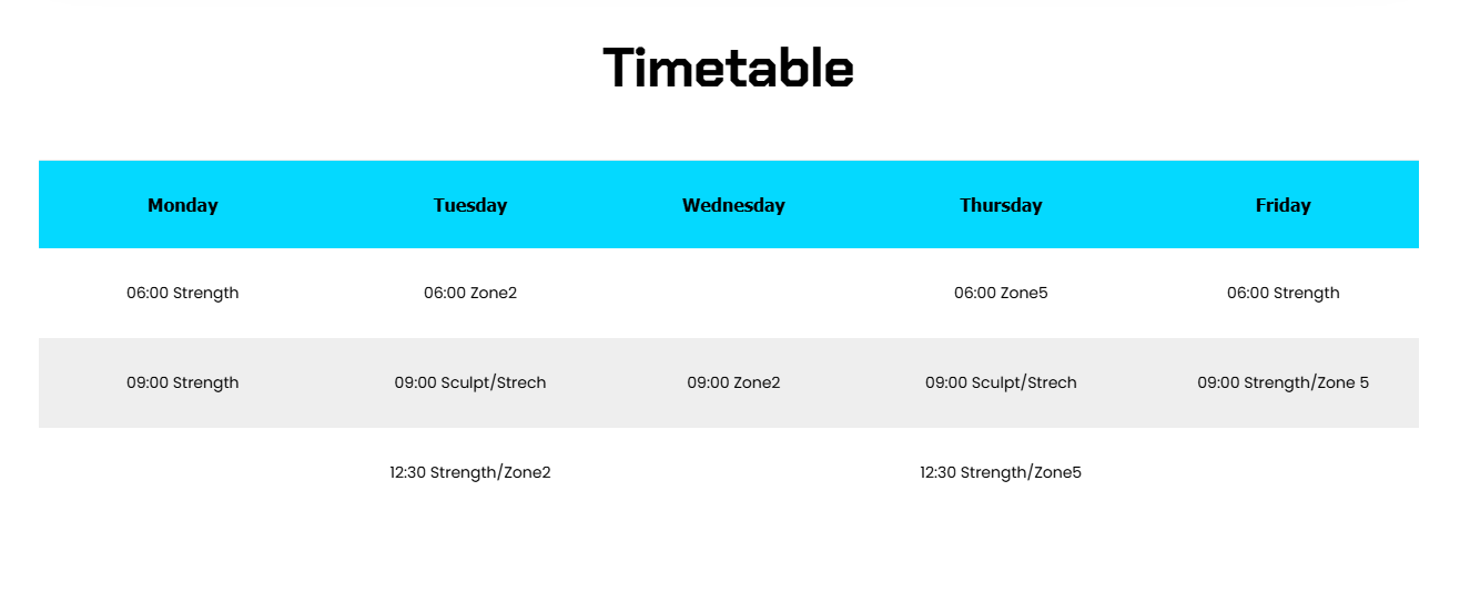 | 09:00 Strength | 09:00 Sculpt/Strech | 09:00 Zone2 | 09:00 Sculpt/Strech | 09:00 Strength/Zone 5 |